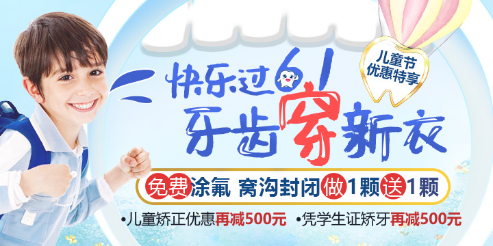 这个六一,除了给孩子买好吃的、好玩的,不如多点关心他/她的牙齿吧!六一儿童节当天儿童矫正在优惠基础上再减500元、凭学生证在优惠基础上再减500元。机会难得,提前预约,可享受优先就诊哦!<<<我要预约就诊